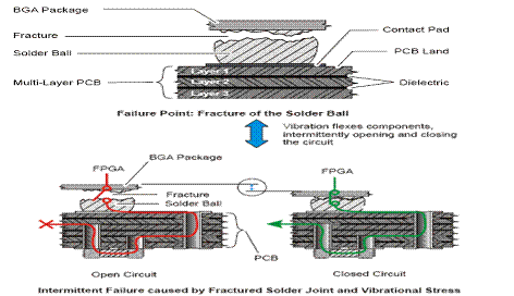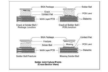 導(dǎo)致裂縫,最終形成斷裂的后續(xù)機(jī)械應(yīng)力還有可能導(dǎo)致斷裂的焊接球的錯(cuò)位。缺失的焊接球不僅使該引腳的連接永久失效,而且錯(cuò)位的焊接球可能會(huì)停留在另一個(gè)位置而導(dǎo)致另一個(gè)電路的不可想像的短路。
