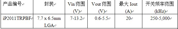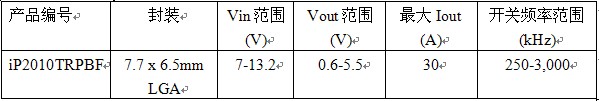 iP2010的輸入電壓范圍為7V至13.2V,輸出電壓范圍則為0.6V至5.5V,輸出電流高達(dá)30A。這個(gè)器件最高運(yùn)行頻率為3MHz。在5MHz運(yùn)行時(shí),與iP2010引腳兼容的iP2011備有相同的輸入和輸出電壓范圍,但后者經(jīng)過(guò)優(yōu)化,從而使最高輸出電流高達(dá)20A。通過(guò)以通用占位面積提供多種電流額定值器件,IR提供的靈活性能夠滿足不同客戶對(duì)電流水平、性能和成本的要求。