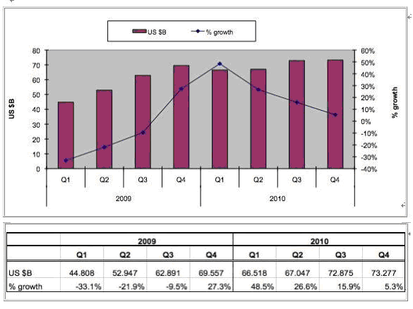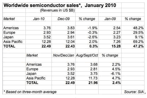 按SIA總裁的看法,全球半導(dǎo)體銷售額1月的最新數(shù)據(jù)(三個(gè)月的移動(dòng)平均值) 比12月的225億美元上升0,3%,分析推動(dòng)市場增長在眾多方面,包括計(jì)算機(jī),手機(jī),汽車電子和工業(yè)應(yīng)用。如果與去年同期相比,銷售額增長達(dá)47%,顯然與09年1月時(shí)正值全球的最低點(diǎn)有關(guān)。