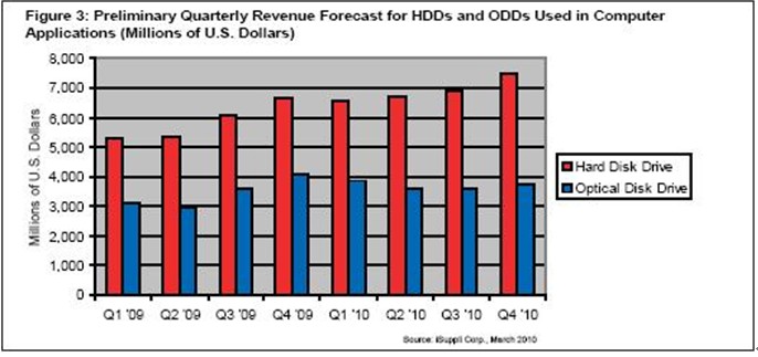 據(jù)iSuppli公司,繼2009年下滑之后,預(yù)計2010年用于電腦的硬盤(HDD)和光驅(qū)(ODD)全球營業(yè)收入將增長,因為PC出貨量將隨著全球經(jīng)濟復(fù)蘇而上升。