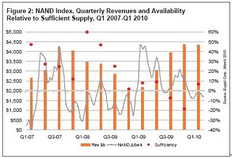 第一季度NAND平均價(jià)格下降4%,而2009年第四季度是下降1.4%。相比于這些相對溫和的變化,2009年第一季度大漲34%。