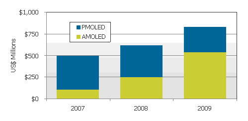 根據(jù)DisplaySearch最新出版OLED出貨及預(yù)測報(bào)告指出,2009年全球OLED面板出貨金額達(dá)8億2千6百萬美元,較去年增長35%,主要增長因素來自于手機(jī)主要屏幕對AMOLED面板需求增加。2009年手機(jī)市場對AMOLED面板需求增加不只貢獻(xiàn)了全球OLED出貨提高,同時(shí)也使得AMOLED產(chǎn)值首度超越PMOLED;根據(jù)DisplaySearch調(diào)查數(shù)據(jù)表示2009年AMOLED面板出貨金額為5億3千7百萬美元,PMOLED則為2億9千1百萬美元。由于智能型手機(jī)要求大尺寸主動式面板趨勢,取代了許多翻蓋式手機(jī)設(shè)計(jì),而翻蓋式手機(jī)次屏多是采用PMOLED面板,也因此對于PMOLED面板需求產(chǎn)生了一定影響。