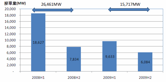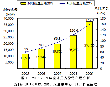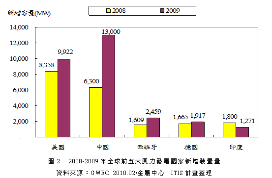 2009年全球風(fēng)力發(fā)電市場(chǎng)不畏金融海嘯沖擊,在美國(guó)及中國(guó)政府大力推廣下,新增風(fēng)力發(fā)電裝置量仍較2008年成長(zhǎng)31%。但因2009年新增容量主要來(lái)自既有存貨,風(fēng)力機(jī)接訂單量?jī)H為15,717MW,較2008年衰退41%。前瞻2010年,在中、美及歐洲風(fēng)電大國(guó)帶動(dòng)下,全球風(fēng)力發(fā)電新增容量將較2009年成長(zhǎng)15%;而風(fēng)力機(jī)接單量受到價(jià)格驟降及主要風(fēng)電大國(guó)景氣回升影響,可望庫(kù)存回補(bǔ)而為2009年的2.2倍。