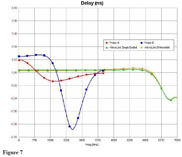 示例探頭的群時延如Figure 7所示。垂直單位是ns。注意,類似于幅度損失,延遲也是被測電路阻抗的函數(shù)。此外,如果有人預(yù)計探頭在信號上產(chǎn)生的影響,特定的信號屬性將包括在仿真中。
