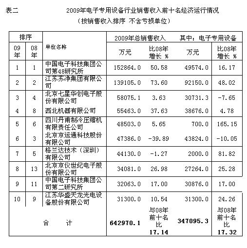 2009年電子專用設(shè)備行業(yè)前十名銷售收入總額達(dá)到64.3億元,占全行業(yè)銷售收入的69.9(2006年為61% 2007年為63.9% 2008年為66.5%),比2008年的前十名銷售收入增長17.14%。入圍前十名的銷售收入也從2008年的2.82億元提高到2009年的3.13億元。中國電子科技集團(tuán)公司第四十八研究所,2009年在太陽能設(shè)備和太陽能電池片的推動下得到了快速的發(fā)展,總銷售收入達(dá)到15.3億元,繼續(xù)位居行業(yè)的首位。