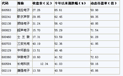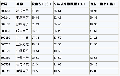 二級(jí)市場(chǎng)的表現(xiàn)一向來都是先于上市公司的經(jīng)營(yíng)情況的。今年以來許多電子類公司就出現(xiàn)了不同程度的上漲,該行業(yè)的今年以來算術(shù)平均漲幅達(dá)20.6%。其中今年以來漲幅最大的是法拉電子,上漲達(dá)65.61%。其次是歌爾聲學(xué),上漲幅度達(dá)62.45%。特別注意的是隨著一季度業(yè)績(jī)的公布,這些大幅上漲的個(gè)股,由于凈利潤(rùn)的同時(shí)上漲,PE也并未明顯增高。