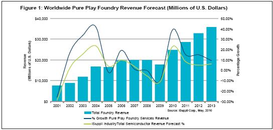 主要晶圓制造商已準備好滿足這種來自消費者和無線市場的需求,開發(fā)出了能夠支持這樣強勁增長的工藝制程。因此,2010年晶圓代工領域的營業(yè)收入擴張速度將超過整體半導體產(chǎn)業(yè)。營業(yè)收入增長將不僅限于領先的晶圓廠商,專業(yè)晶圓供應商的營業(yè)收入也將增長。它們與新設計相配套的利基產(chǎn)品,使其能夠創(chuàng)造驚人的增長,因此同樣會從中受益。