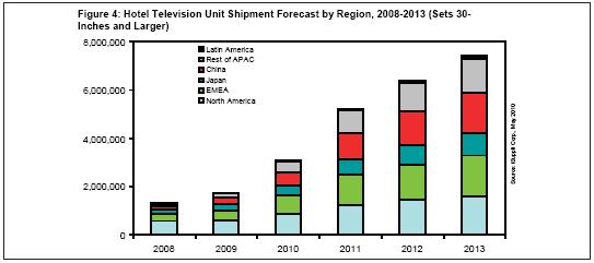 預(yù)計2013年酒店電視出貨量將從2009年的170萬臺增長到740萬臺(譯者注:從此處看,是增長“近四倍”),復(fù)合年度增長率為55%。此處出貨量是指尺寸大于或等于30英寸的酒店客房電視出貨量。