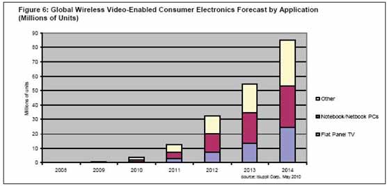 iSuppli公司預(yù)測(cè),2014年具有高帶寬無(wú)線視頻接口的支持視頻的CE設(shè)備市場(chǎng)將增長(zhǎng)到8520萬(wàn)個(gè)以上,而2009年是60.6萬(wàn)個(gè),該期間的復(fù)合年度增長(zhǎng)率為169.0%。到2014年,逾5300萬(wàn)個(gè)此類設(shè)備將是支持無(wú)線視頻的數(shù)字電視和面向消費(fèi)類上網(wǎng)本/筆記本。