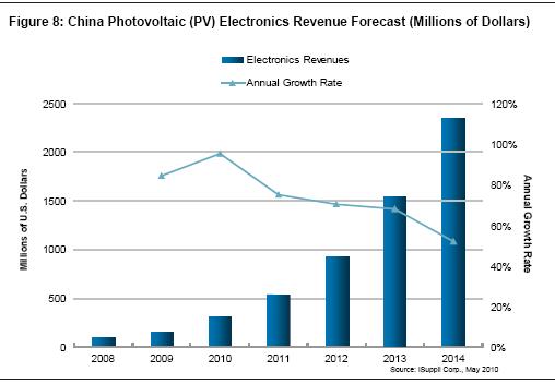 隨著政府補貼計劃在2010年達到頂點,光伏電子市場也將同時觸頂。盡管預計接下來三年年增長率下降——除非出臺新的政策,但該市場將繼續(xù)保持一定的勢頭,足以在2014年實現24億美元的銷售收入。