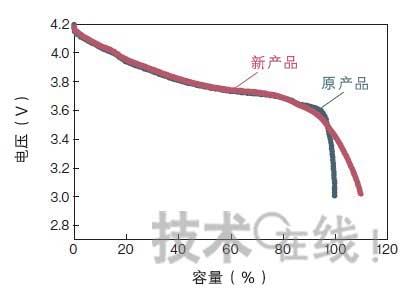 新產(chǎn)品的最大特點(diǎn)是,具有與原有鋰離子充電電池幾乎相同的放電曲線,并且實(shí)現(xiàn)了高容量化(圖1)。由于充電電壓和工作電壓與原來(lái)的鋰離子充電電池相同,因此產(chǎn)品廠商無(wú)需改變產(chǎn)品的電源系統(tǒng)即可利用。