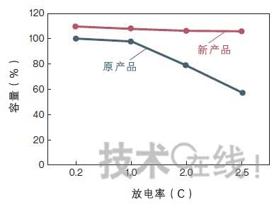 新產(chǎn)品不但容量大,大電流下的充放電特性也十分出色。充電時(shí)間可比原產(chǎn)品縮短約30%。放電方面,即使在2.5C的放電率下容量也不會(huì)降低,可用于高輸出產(chǎn)品(圖2)注1)。