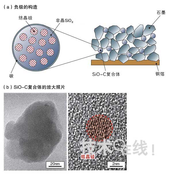 日立麥克賽爾在非晶SiO2內(nèi)分散了粒徑僅為3nm左右的硅。另外,為提高導(dǎo)電性,采用了利用碳包覆SiO2的SiO-C復(fù)合體(圖3)。實(shí)際上,SiO-C復(fù)合體隨著初期充電,非晶SiO2會(huì)變成鋰與硅的化合物硅酸鋰,具有鋰離子的傳導(dǎo)性,可在SiO-C復(fù)合體內(nèi)的硅中脫插鋰離子。