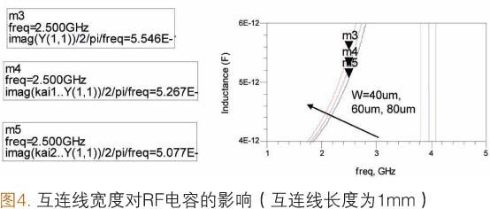 除互連線長度之外,互連線的寬度也會對RF電容產(chǎn)生影響。在襯底的制作過程中,線寬通常會發(fā)生變化(舉例來說,與設(shè)計寬度相比,實際線寬的變化范圍為±10.0μm~±15.0μm)。如圖4所示,如果設(shè)計的互連線為1.0mm長,60.0μm寬,實際卻達到40.0μm寬,在2.5GHz下等效電容變化將達到5.3%(以3.0pF接地SMD電容為例)。如果把這種SMD電容用于濾波器中,對于RF應(yīng)用來說,電容值5.3%的變化將導(dǎo)致約2.7%的頻移。我們必須對RF應(yīng)用中含有SMD電容的RFSiP模塊的襯底制造容差進行細致研究。