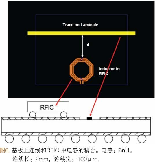 為了對主時鐘線和RF元件之間的相互作用進行分析,把壓控振蕩器(VCO)中使用的RF電感(6.0nH)放置在穿通多層襯底的時鐘互連線附近(圖6)。我們在這個研究中使用的互連線長為2.0mm。當(dāng)VCO電感和互連線之間的橫向距離(d)大于0.5mm時,產(chǎn)生的耦合信號將小于-80.0dB。耦合信號的實際要求由SiP系統(tǒng)級電設(shè)計決定。