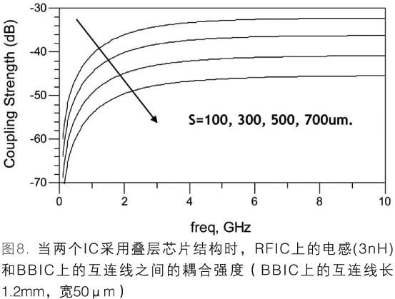 圖8表示了BBIC和RFIC電感之間的耦合強度(未使用隔離層)。假設(shè)BBIC和RFIC的厚度為250.0μm時,對VCO電路中的3nH電感進行了研究。BBIC中主時鐘的互連線設(shè)置為1.2mm長。根據(jù)模擬結(jié)果,當(dāng)橫向距離(S)為100.0μm時,2.5GHz下的隔離為-35dB。這一隔離值對大多數(shù)RF應(yīng)用來說是不夠的。當(dāng)橫向距離為700.0μm時,隔離值提高為-50dB,這個值對大多數(shù)RF應(yīng)用來說仍然不夠。為保證VCO電感的性能,位于BBIC電感上方的主時鐘不能使用長互連線。根據(jù)以上分析,我們還應(yīng)對RFSiP使用的疊層芯片法做進一步研究,從而判斷BBIC和RFIC器件之間出現(xiàn)嚴重相互干擾的可能性。