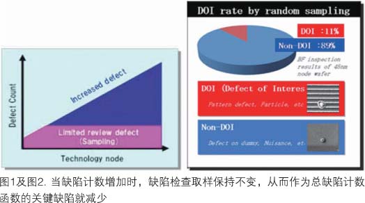 半導(dǎo)體制造中廣泛采用晶圓自動(dòng)檢測(cè)系統(tǒng)已逾30年。在線(xiàn)晶圓檢測(cè)有助于推進(jìn)制造技術(shù)的發(fā)展,它能早期檢測(cè)到工藝中的缺陷,從而減少開(kāi)發(fā)時(shí)間并防止產(chǎn)出超時(shí)。過(guò)去,檢測(cè)缺陷的能力是主要關(guān)注點(diǎn)之一,但現(xiàn)在的要求改變了。近幾年來(lái),每一晶圓的缺陷計(jì)數(shù)迅速增長(zhǎng)至每一晶圓多達(dá)100萬(wàn)個(gè)缺陷,這是因?yàn)榫A尺寸變大,同時(shí)檢測(cè)技術(shù)靈敏度更高了(圖1)。雖然總檢測(cè)計(jì)數(shù)增加及關(guān)鍵缺陷尺寸變得更小,這一時(shí)期缺陷檢查的典型策略并未改變,尤其是在隨機(jī)取樣占主導(dǎo)的缺陷檢查區(qū)域。這種情況能產(chǎn)生常與干擾缺陷在一起的缺陷pareto圖(圖2)。