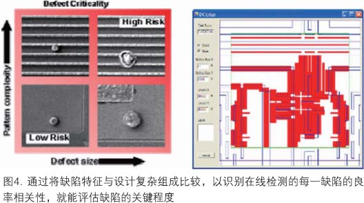 為了提高監(jiān)測(cè)和識(shí)別關(guān)鍵缺陷的效率,必須采用新方法。依賴(lài)簡(jiǎn)單的缺陷過(guò)濾和基于大小的缺陷次序是不夠的。為了取得最佳的檢測(cè)和鑒評(píng)預(yù)算,必須對(duì)檢測(cè)設(shè)置與鑒評(píng)策略二者使用新的知識(shí)信息。從設(shè)計(jì)和模擬得到的關(guān)鍵區(qū)域和熱點(diǎn)這樣一些知識(shí)信息可以插入檢測(cè)方略中,優(yōu)化可用的檢測(cè)容量。在完成檢測(cè)過(guò)程中和完成后,基于多重檢測(cè)結(jié)果的缺陷過(guò)濾和分類(lèi)使用戶(hù)能快速識(shí)別新缺陷,有效地量化已知的缺陷類(lèi)型。利用設(shè)計(jì)空間中缺陷鄰近位置的信息(此處,設(shè)計(jì)的復(fù)雜組成是了解的),可以較好地評(píng)估每一缺陷的良率相關(guān)性,提供缺陷的排序(圖4)。