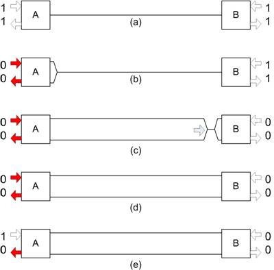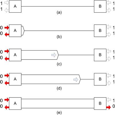 我們的下一種情況(圖2)假設(shè),節(jié)點(diǎn)A再次發(fā)起一條消息,但是節(jié)點(diǎn)B在稍后發(fā)起的一條消息具有更高的優(yōu)先級(jí)。如前所述,這種情況以兩個(gè)節(jié)點(diǎn)均處在非占用模式作為開始,如(2a所示,隨后節(jié)點(diǎn)A變?yōu)檎加茫ㄈ纾?b)所示)發(fā)起一條消息。該占用差動(dòng)電壓再次沿線纜傳輸。在信號(hào)到達(dá)B處的收發(fā)器以前,該節(jié)點(diǎn)剛好利用如(2c)所示占用位發(fā)起一條消息。這時(shí),兩個(gè)節(jié)點(diǎn)都正傳輸一個(gè)占用位,并且兩個(gè)節(jié)點(diǎn)都正接收一個(gè)占用位(如(2d)所示),然后兩個(gè)節(jié)點(diǎn)都沒意識(shí)到另一個(gè)節(jié)點(diǎn)也已啟用。由于在我們的假設(shè)情況中,節(jié)點(diǎn)A具有比節(jié)點(diǎn)B更低的優(yōu)先級(jí),因此有時(shí)節(jié)點(diǎn)A會(huì)通過將其TXD設(shè)置為0(如(2e)所示)來發(fā)出一個(gè)非占用位。但是,由于節(jié)點(diǎn)B的作用,RXD會(huì)感應(yīng)到總線仍然處在占用狀態(tài)下。