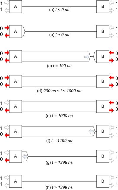 圖3中,節(jié)點(diǎn)A在時(shí)間t=0時(shí)開始一條消息,從而在總線(b)上傳輸一個(gè)占用位。如圖2所示,其可能出現(xiàn)的情況是,節(jié)點(diǎn)B剛好在節(jié)點(diǎn)A的信號(hào)被接收到以前(c)開始發(fā)送,也即時(shí)間t=199ns。當(dāng)時(shí)間t=1000ns的第二位開始之初,在節(jié)點(diǎn)A轉(zhuǎn)到非占用狀態(tài)以前兩個(gè)節(jié)點(diǎn)都沒意識(shí)到對(duì)方的有效性。然后,節(jié)點(diǎn)B在時(shí)間t=1199ns的第二位開始之初,轉(zhuǎn)到非占用狀態(tài)。另一個(gè)單向延遲以后,該非占用信號(hào)到達(dá)節(jié)點(diǎn)A,時(shí)間t=1399ns。只有在這時(shí),節(jié)點(diǎn)A才讀取RXD信號(hào),并且可以確定其代表網(wǎng)絡(luò)的真實(shí)狀態(tài)。