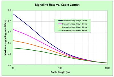 下面顯示了信號(hào)速率和線纜長(zhǎng)度之間的權(quán)衡因素,以及收發(fā)器延遲帶來的影響。收發(fā)器帶來的延遲(包括相關(guān)隔離、電平轉(zhuǎn)換和保護(hù))對(duì)于500kbps及以上的信號(hào)速率特別明顯。