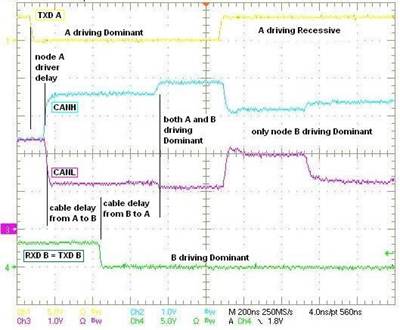 注意,只通過等到兩倍單向延遲(或者相當(dāng)于總雙向傳輸時(shí)間)節(jié)點(diǎn)A才能判別這種情況,其中節(jié)點(diǎn)A和B的消息具有相同的優(yōu)先級(jí)(情況3),以及節(jié)點(diǎn)B的消息擁有更高的優(yōu)先級(jí)。由于CAN協(xié)議固有的逐位仲裁機(jī)制,這種雙向延遲必須較好地位于一個(gè)位時(shí)間預(yù)算范圍內(nèi),也即1000ns。否則,在第二個(gè)位仲裁完成以前,節(jié)點(diǎn)A就可能開始傳送其第三個(gè)位。