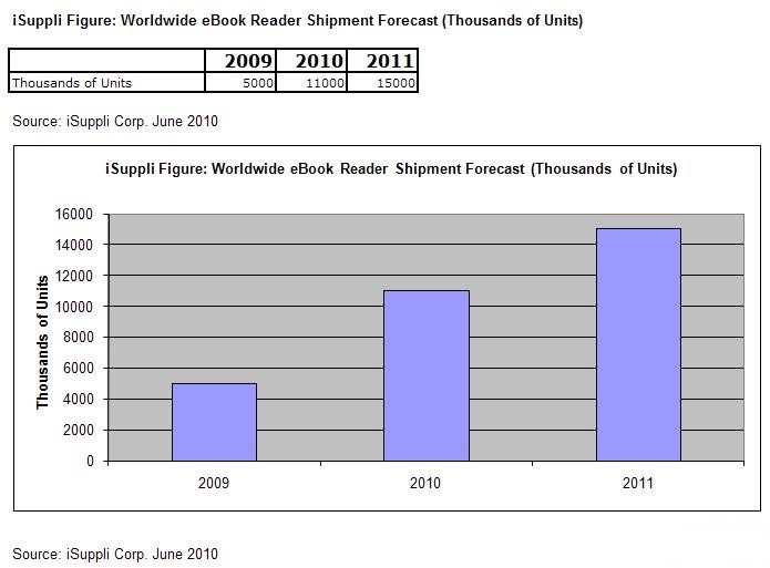 短期內(nèi),當(dāng)電子書閱讀器的價格壓低到iPad起始價格點的一半左右時,可能會吸引消費者購買電子書閱讀器。不過,長期來看,電子書閱讀器仍可能有著比最初預(yù)期的更多利基。iSuppli預(yù)測,全球電子書閱讀器出貨量在2010年將達1,100萬部,2011年還可望成長120%,達到1,500萬部。
