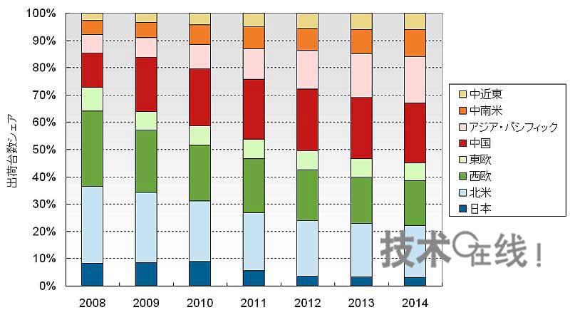 出處:DisplaySearch“中國TV市場調(diào)查報告2010年版” 中國市場作為全球電視市場的消費地的地位將會進一步提高。2011年液晶電視供貨量將超過北美,2012年平板電視需求將超過5000萬臺(圖1)。