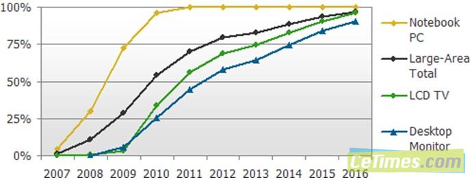 LED背光源已經(jīng)成為T(mén)FT LCD產(chǎn)業(yè)一個(gè)重要的關(guān)鍵零組件,并且在未來(lái)幾年將持續(xù)成長(zhǎng)。根據(jù)DisplaySearch最新一季「LED背光源研究分析報(bào)告」中指出,估計(jì)在2012年第四季大尺寸液晶面板采LED背光源面板出貨量將超過(guò)冷陰極燈管(CCFL)背光源面板出貨量,且滲透率將高達(dá)80%。