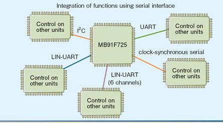 車用MCU連接的外圍相當(dāng)多樣,而連接的接口可能是UART、頻率同步串行、LIN-UART和I2C,因此必須具備彈性的接口連接能力。為了滿足此需求,富士通將內(nèi)置式多功能串行接口用作串行通信接口,并透過軟件方式來切換上述各種接口,以靈活支持外部組件的通信規(guī)范,并提高系統(tǒng)設(shè)計(jì)的自由度。新系列MCU還提供LIN-UART的6條通道,從而能夠與更多控制單元進(jìn)行通信;其中MB91725系列因具有定時(shí)器功能的多條信道和A/D轉(zhuǎn)換器,更容易達(dá)成各種功能的整合。請(qǐng)參考(圖二)。