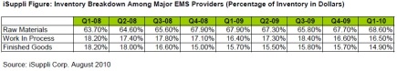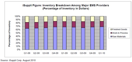 iSuppli指出,觀察全球前五大電子制造服務(EMS)的最新庫存狀況顯示,在2010年第一季,零組件與原材料占據(jù)近七成的總庫存量;相對來看,在制品(work-in-process goods)占據(jù)總庫存量的比例為17%,成品(finished goods)所占比例則低于15%。