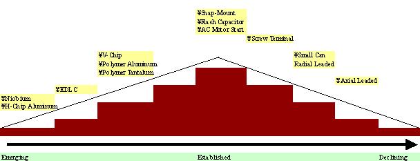 鋁電容器技術(shù)路線圖已經(jīng)發(fā)展到一個節(jié)點上,在此新投資聚集在鋁固體聚合物元件,以及作為替代技術(shù)的碳和鈮介質(zhì)開發(fā)上。更完善的產(chǎn)品,如單元安裝電容器(snap-mount)、閃光電容器(flash capacitor),和馬達啟動鋁電容器(motor start aluminum capacitors)已收到有限的投資,但繼續(xù)服務(wù)于更小的、增值的電容細分市場。老產(chǎn)品用于新技術(shù)研發(fā)所獲得的資金支持會更少,包括標準的徑向引線鋁電容器和軸向鋁電容器。例如,軸向引線鋁電容器,近些年來已經(jīng)很少受到關(guān)注,但是他們現(xiàn)在作為一個傳統(tǒng)產(chǎn)品,在國防和汽車應(yīng)用方面仍然保有市場。當用于上述圖表中列舉的所有主要產(chǎn)品的投資,在過去20年中獲得了不同程度的回報之時,市場已經(jīng)轉(zhuǎn)向鋁固體聚合物電容設(shè)計,行業(yè)中的主要供應(yīng)商正在調(diào)整自己的定位以把握巨大的市場機會。而且,在一些不同用途的關(guān)鍵細分市場上,如醫(yī)療電子,石油和天然氣勘探等領(lǐng)域,引入導(dǎo)電聚合物鋁技術(shù),也會帶來增值和在特定應(yīng)用市場的機會。