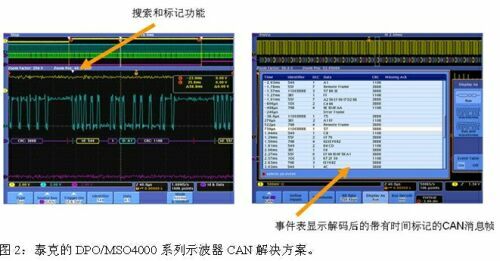 對于汽車中常用的CAN、LIN這類低速串行總線的調(diào)試,泰克的DPO/MSO4000系列示波器提供了簡單、易用、完整、高品質(zhì)的觸發(fā)、捕獲和解碼解決方案。如圖2,該示波器系列提供了搜索和標記功能,可在事件表顯示解碼后的帶有時間標記的CAN消息幀,這一功能是其他競爭性產(chǎn)品所不具備的。