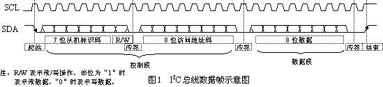 如圖1所示是常見的I2C總線上傳輸?shù)囊蛔止?jié)數(shù)據(jù)的數(shù)據(jù)幀,其總線形式是由數(shù)據(jù)線SDA和時鐘SCL構(gòu)成的雙線制串行總線,并接在總線上的電路模塊即可作為發(fā)送器(主機)又可作為接收器(從機)。幀數(shù)據(jù)中除了控制碼(包括從機標(biāo)識碼和訪問地址碼)與數(shù)據(jù)碼外還包括起始信號、結(jié)束信號和應(yīng)答信號[4]。