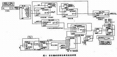 根據(jù)設(shè)計電路原理框圖,曲譜碼以分頻數(shù)編碼,音高信號分頻由一個可預(yù)置的模N計數(shù)器實現(xiàn)。分頻系數(shù)表和曲譜表都存儲在ROM中。若希望控制蜂鳴器的信號占空比為50%,分頻器的輸出信號采用二分頻電路實現(xiàn)占空比整形,但注意信號頻率被降低一半。電路原理框圖中M分頻器的作用是產(chǎn)生合適的時值計數(shù)脈沖頻率。電路的頂層原理圖如圖4所示。