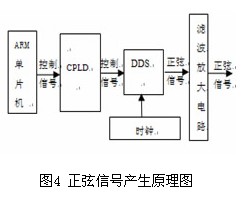 采用DDS技術(shù)在當(dāng)前的測試測量行業(yè)已是一種主流的做法,其頻率精度可隨相位累加器的位數(shù)而定。本系統(tǒng)采用單片機(jī)+專用DDS芯片的方式產(chǎn)生正弦信號,其原理如圖4所示,ARM單片機(jī)向CPLD 發(fā)出控制命令,CPLD 在時(shí)鐘下譯碼后產(chǎn)生DDS的控制信號,產(chǎn)生出相應(yīng)頻率的正弦波信號,該正弦信號經(jīng)過濾波放大后,輸出相應(yīng)幅值的正弦信號。