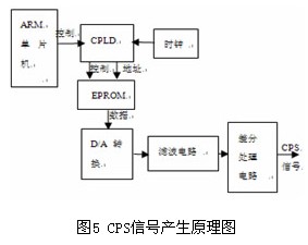 曲軸位置信號(CPS)是PCM控制點(diǎn)火系統(tǒng)中最主要的傳感器信號,為適應(yīng)多種PCM的需求,設(shè)計(jì)采用CPLD和DA的方式產(chǎn)生。CPS信號產(chǎn)生原理如圖5所示,在EPROM中存有一個周期的正弦表數(shù)據(jù),當(dāng)需要產(chǎn)生 CPS信號時(shí),ARM單片機(jī)對CPLD進(jìn)行設(shè)置,CPLD根據(jù)接收的控制命令,通過時(shí)鐘計(jì)數(shù),產(chǎn)生讀存儲器的信號,并向EPROM提供合適的地址信號和控制信號,EPROM輸出相應(yīng)地址的數(shù)據(jù),經(jīng)D/A轉(zhuǎn)換,變成單端CPS模擬信號,然后經(jīng)濾波電路和單端轉(zhuǎn)差分處理電路,輸出CPS差分信號。在實(shí)際的電路實(shí)現(xiàn)中,對CPS信號的控制可由計(jì)算機(jī)通過CAN總線向ARM發(fā)出控制命令進(jìn)行設(shè)置,因此,即使ARM芯片在運(yùn)行過程中復(fù)位,電路仍能輸出正確的CPS信號,以確保測試周期的正常進(jìn)行。