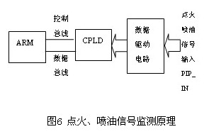 點(diǎn)火和噴油信號是汽車發(fā)動機(jī)中的關(guān)鍵信號,其周期和時(shí)序直接關(guān)系到汽車的運(yùn)行狀態(tài),因此監(jiān)測它們的周期和時(shí)序尤為重要。本系統(tǒng)監(jiān)測原理圖如圖6 所示,對于點(diǎn)火信號的監(jiān)測,主要是監(jiān)測它與CPS信號的同步,以及兩個或四個點(diǎn)火信號之間的時(shí)序關(guān)系。當(dāng)CPLD尋找到點(diǎn)火信號與CPS同步的起始點(diǎn)后,根據(jù)輸入的PIP_IN信號,對各點(diǎn)火信號進(jìn)行計(jì)數(shù)。每當(dāng)一個點(diǎn)火周期完成后,在下一個點(diǎn)火周期向ARM 單片機(jī)產(chǎn)生一個中斷信號。該中斷信號觸發(fā)ARM 單片機(jī)進(jìn)入中斷處理程序,在該中斷程序中,ARM單片機(jī)讀入對各點(diǎn)火信號的計(jì)數(shù)值,判斷點(diǎn)火信號的時(shí)序和周期,并設(shè)置點(diǎn)火信號正常與否的標(biāo)志。對于噴油信號的監(jiān)測,主要是監(jiān)測它與CPS信號的同步,以及它們之間的時(shí)序關(guān)系。當(dāng)PIP_IN信號中四個噴油信號中任何一個信號的下降沿到來時(shí),CPLD都會監(jiān)測其它三個噴油信號的狀態(tài),如果其它三個噴油信號的狀態(tài)正常,即給出噴油信號正常標(biāo)志,反之給出噴油信號異常標(biāo)志。