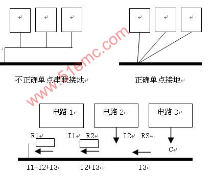 可見(jiàn)串聯(lián)接地容易引起干擾。對(duì)于模擬電路,具有工作與低頻狀態(tài)、靈敏度高的特點(diǎn),采用單點(diǎn)接地(即接地路線與單獨(dú)一個(gè)參考點(diǎn)相連,圖6給出了正確與錯(cuò)誤單點(diǎn)接地方式對(duì)照)可防止來(lái)自其它噪聲元件(如數(shù)字邏輯器件、電源、繼電器、電動(dòng)機(jī))的大接地電流爭(zhēng)用敏感的模擬地線。同時(shí)系統(tǒng)采用光耦將數(shù)字地與模擬地隔離,抑制地點(diǎn)平擺動(dòng)帶來(lái)的影響;采用鐵氧體墊片來(lái)防止寄生電容形成接地環(huán)路。在實(shí)際設(shè)計(jì)中應(yīng)注意采用多點(diǎn)接地時(shí)的諧振問(wèn)題,在每個(gè)電源與接地之間的地連接中應(yīng)使用高質(zhì)量的去耦電容。