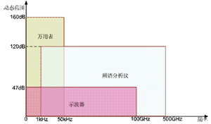假定黑盒內(nèi)部的電路和信號(hào)輸入均正常,如果黑盒的輸出仍然有問(wèn)題,這時(shí)就應(yīng)該重點(diǎn)排查電源輸入。常用的電源檢測(cè)儀器有示波器、頻譜儀和數(shù)字萬(wàn)用表,它們能夠覆蓋的測(cè)量范圍不同(如圖2所示),應(yīng)該綜合運(yùn)用這些儀器來(lái)全面觀(guān)察電源信號(hào),避免測(cè)試盲區(qū)。