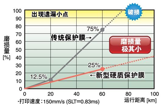 為了應(yīng)對這種情況,采取了將打印頭的保護膜材料變更為硬質(zhì)材料等對策,但提高保護膜的強度的課題是保護膜的組成和發(fā)熱部分的形狀設(shè)計。在以往的產(chǎn)品中,使用某些劣質(zhì)熱敏紙時,使用壽命僅10km左右,這當然與打印機的使用頻率也有關(guān)系,但發(fā)生過幾個月左右就無法使用的案例。羅姆面對這種情況,一直致力于改善保護膜材料中的硬質(zhì)材料的結(jié)構(gòu)和打印頭結(jié)構(gòu)。這次開發(fā)的熱敏打印頭通過優(yōu)化保護膜材料的構(gòu)成物質(zhì)及其組成,大幅提高了耐磨性,實現(xiàn)了比以往產(chǎn)品高約3倍的耐久性(保證150km(以往產(chǎn)品是50km))。另外,通過提高保護膜的熱導(dǎo)率,打印效率也比以往改善了15%,同時還提高了打印質(zhì)量。而且,這種打印頭的形狀保持與以往產(chǎn)品完全相同,因此無需進行打印機的設(shè)計變更,另外,這種規(guī)格還可以用于修補替換。