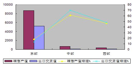 西部地區(qū)銷售產(chǎn)值和出口交貨值分別增長(zhǎng)46.9%和48%,出口高出行業(yè)平均水平25.3和33.2個(gè)百分點(diǎn)。四川、重慶正逐步成為行業(yè)新的增長(zhǎng)極,銷售產(chǎn)值分別增長(zhǎng)45%和162.5%。
