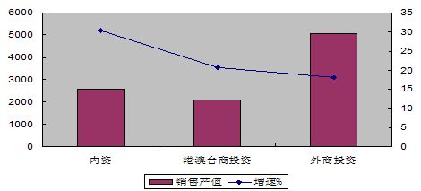 三資企業(yè)實(shí)現(xiàn)銷售產(chǎn)值7132億元,增長(zhǎng)18.7%;出口交貨值4932億元,增長(zhǎng)14.4%,分別低于行業(yè)平均水平2.9和0.4個(gè)百分點(diǎn)。其中港澳臺(tái)企業(yè)銷售產(chǎn)值增長(zhǎng)20.7%,外商投資企業(yè)增長(zhǎng)18.0%。