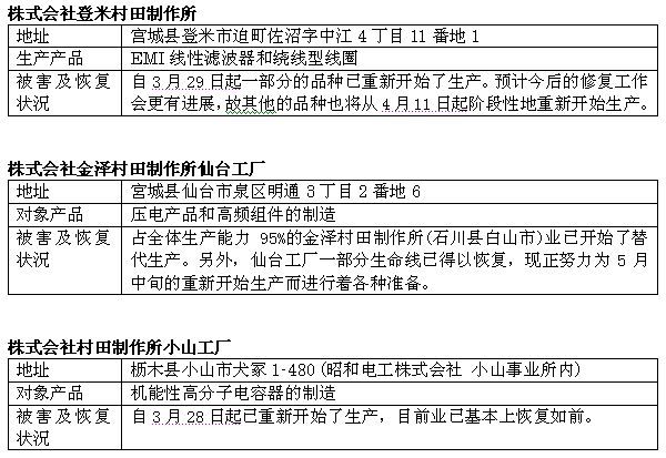在之前,本網(wǎng)站曾報道過,截至23日18時,日本東部大地震對日本村田制作所位于宮城縣和櫪木縣的三個受災(zāi)工廠的破壞程度。今天日本村田制作所再次發(fā)表聲明,告知三個受災(zāi)工廠的恢復(fù)程度。