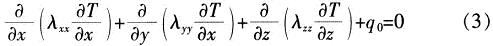 式中:T/x,T/y,T/z為沿x,y,z方向的溫度梯度;λxx,λyy,λzz為熱導(dǎo)率;q0為單位體積的熱生成;ρc是密度與比熱容的乘積:dT/dt為溫度隨時(shí)間的變化率。