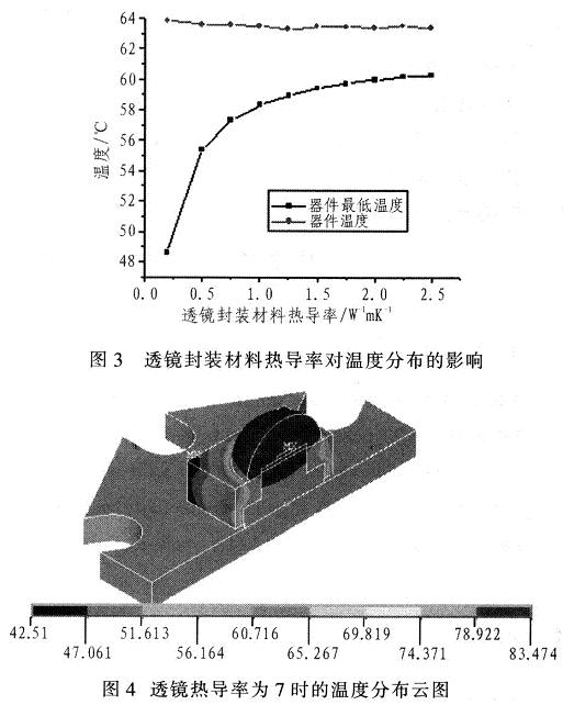 只考慮熱傳導(dǎo)與對流,改變不同封裝填充材料如硅樹脂.得出結(jié)果,如圖3所示。即使找到一種熱導(dǎo)率高達(dá)7Wm-1K-1的環(huán)氧樹脂成分封裝材料時(shí),相比使用熱導(dǎo)率為0.25Wm-1K-1的環(huán)氧樹脂成分封裝材料時(shí),芯片溫度下降不多,鋁基板溫度只下降了2.271℃,最大功率僅提高了0.69W。實(shí)際上,熱導(dǎo)率值超過7Wm-1K-1以上、可商業(yè)化的透明硅樹脂封裝材料目前尚無文獻(xiàn)報(bào)導(dǎo)。分布云圖如圖4所示。