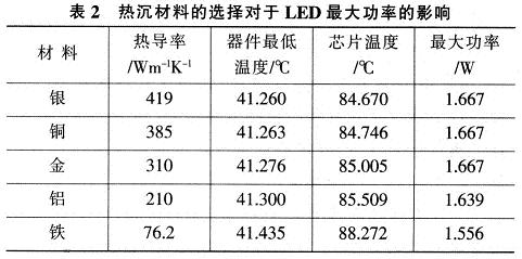 表2給出透鏡熱導(dǎo)率為0.2Wm-1K-1時(shí),不同熱沉材料的導(dǎo)熱系數(shù)對于LED最大功率影響。由表2看出,熱沉材料對于LED的最大散熱能力的影響很小。[page]