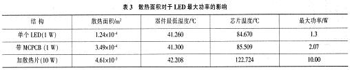 表3為3種不同散熱方式對LED的溫度分布、最大功率的影響??梢钥闯觯黾由崦娣e是很好的散熱方式,可以輕易地提高LED器件散熱能力,這是目前LED產(chǎn)品所普遍使用的散熱方式之一。然而缺點(diǎn)也很明顯:影響成本、增加產(chǎn)品重量、影響封裝密度。無限度地提高LED散熱片面積顯然不現(xiàn)實(shí),因此一般使用1.5inch2散熱片提升LED產(chǎn)品最大功率至10W左右,出于成本等因素就不能繼續(xù)提高。