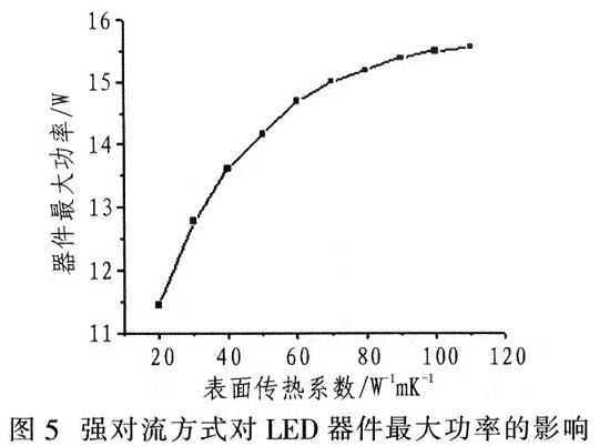 常見對流散熱方式有兩種:自然對流和強(qiáng)制對流。固定結(jié)構(gòu)的散熱與表面?zhèn)鳠嵯禂?shù)有關(guān)??绽浞绞綍r(shí),不同傳熱系數(shù)對最大功率的影響如圖5所示。強(qiáng)對流方式在一定速度內(nèi)會大大提高LED產(chǎn)品的散熱能力,有助于提高散熱效果。