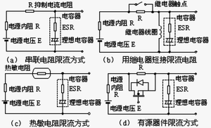 遠遠高于鋁聚合物電解電容器的紋波電流承受能力。必須考慮上電過程的沖擊電流限制??梢圆捎肁C/DC變換器上電電流限制方法,如串聯(lián)限流電阻,見圖2(a),則: